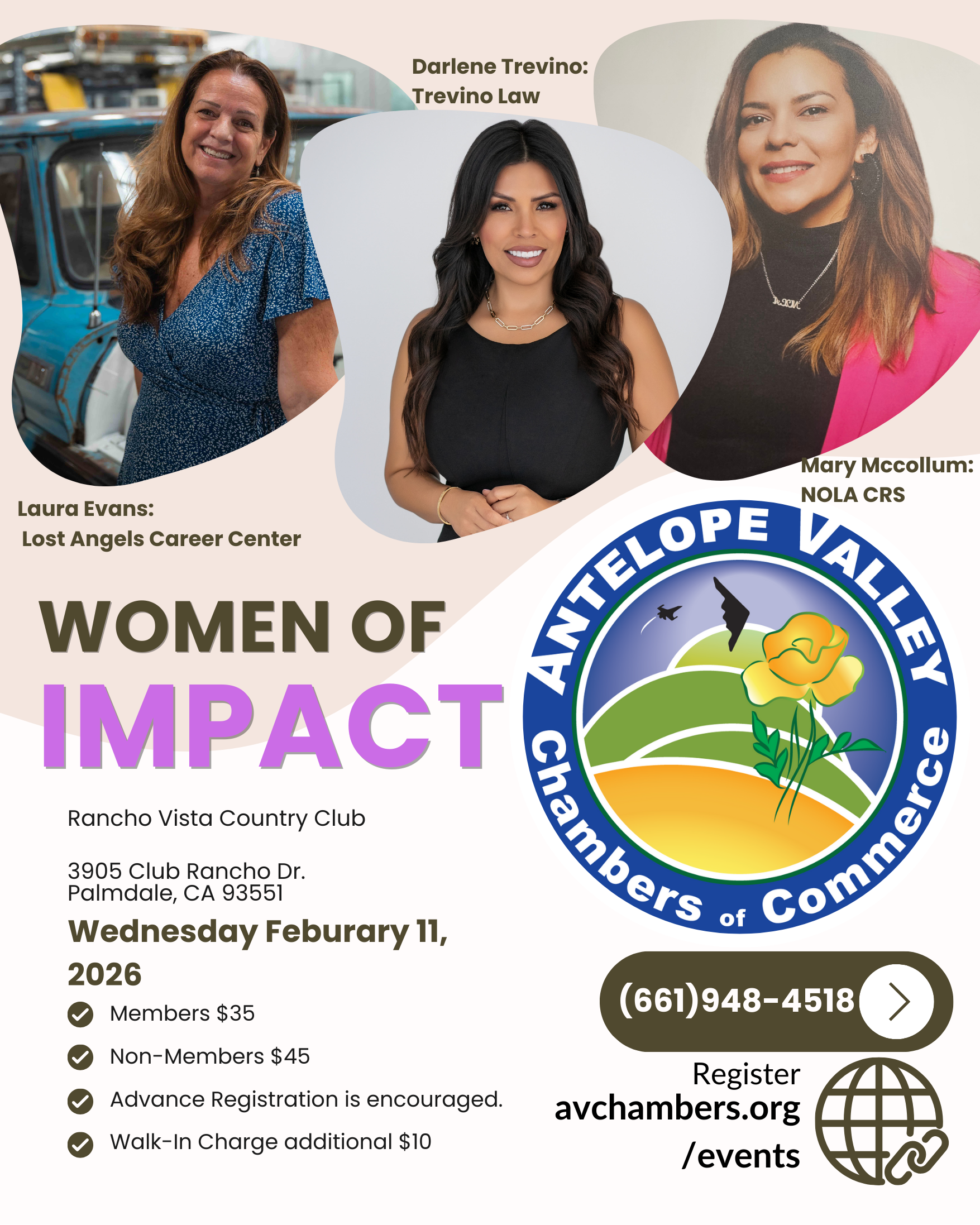 Ready to be inspired? ⚡️ Join us on February 11th for our Women of Impact panel. We’re sitting down with the innovators and icons who are shaping the future of Antelope Valley. No fluff—just real talk on leadership, legacy, and how to make your mark. Why attend?